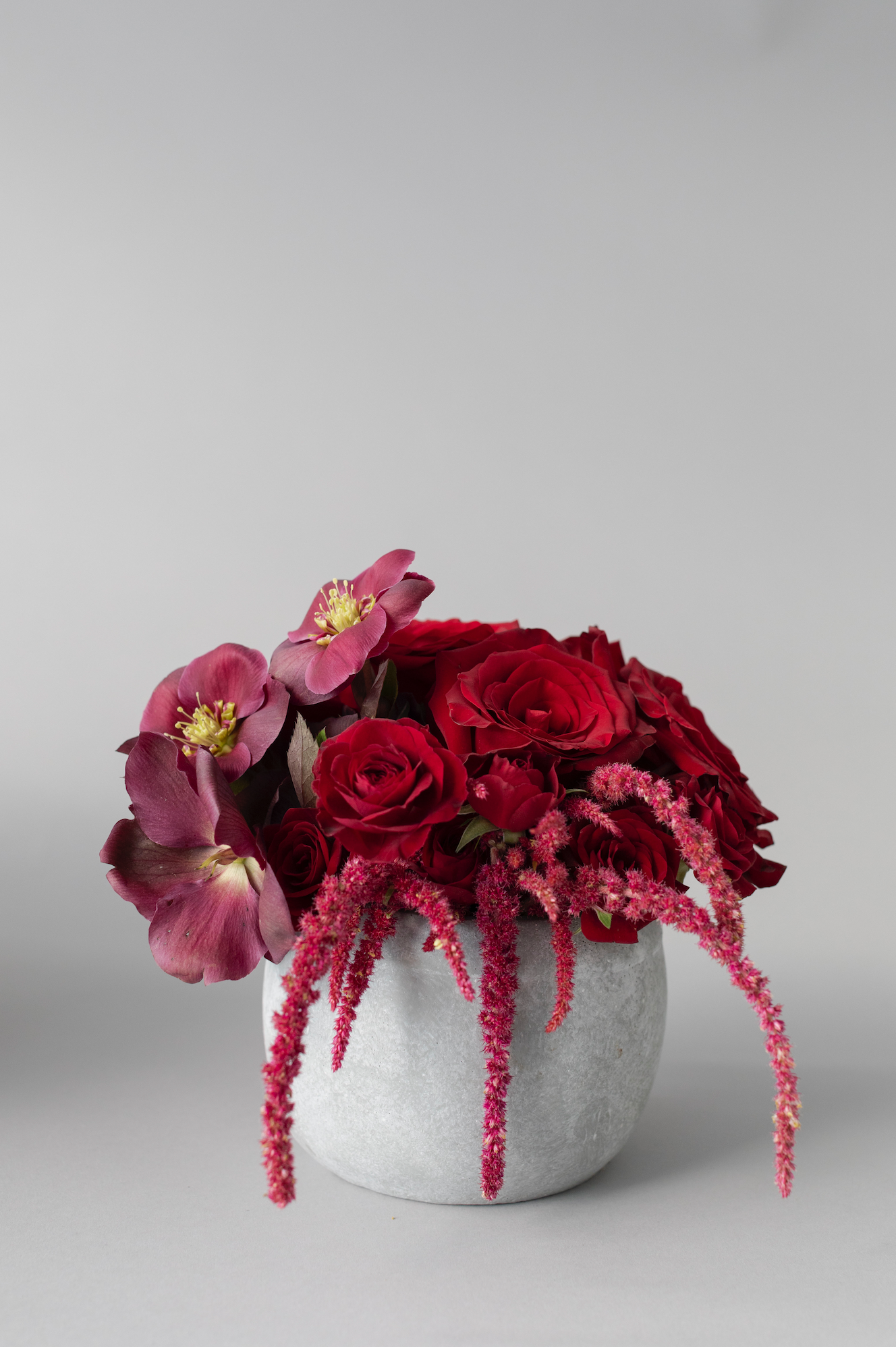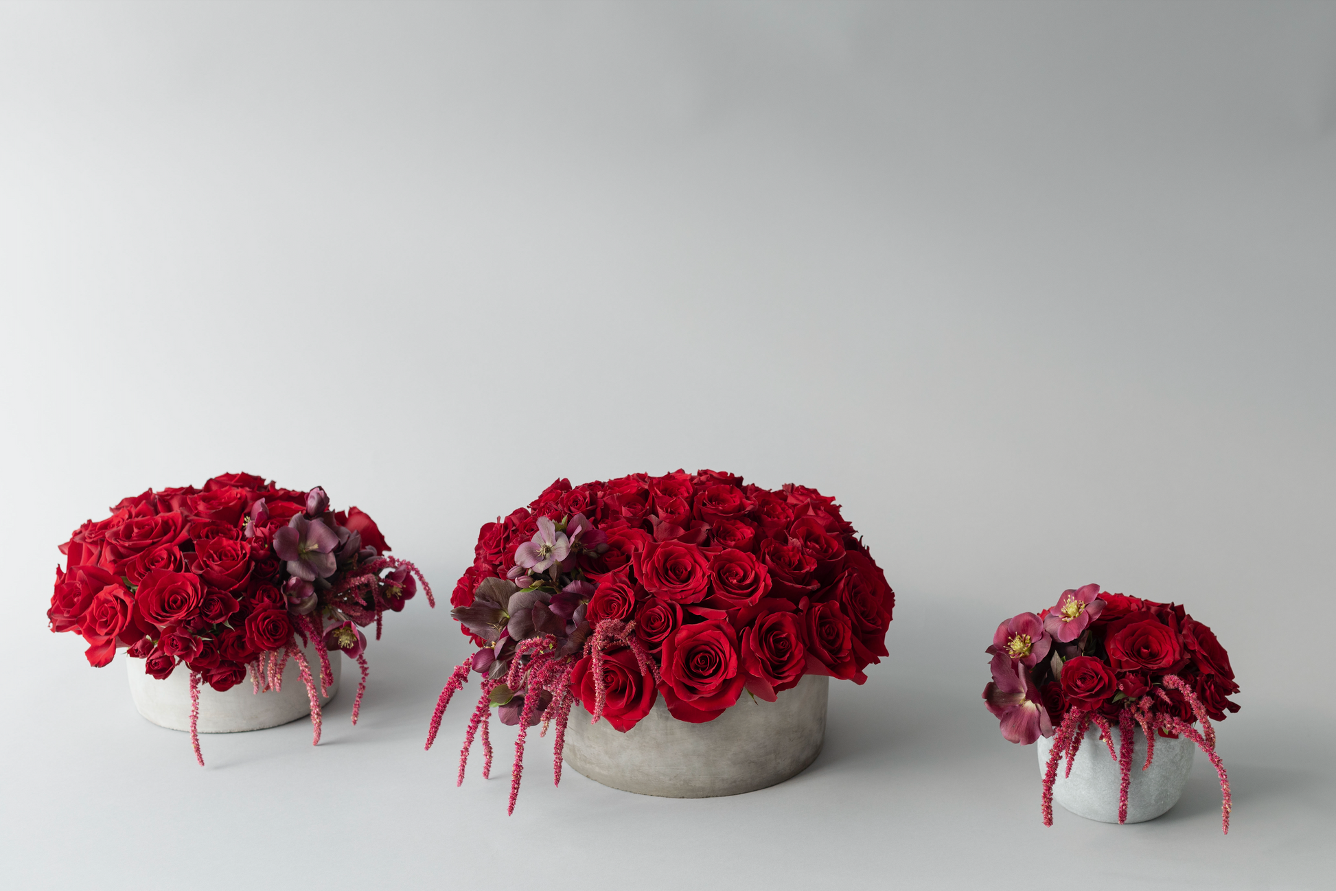 Queen of Hearts - An elegant pave arrangement with a round and tight design, featuring red roses, with touches of deep berry tone groupings.